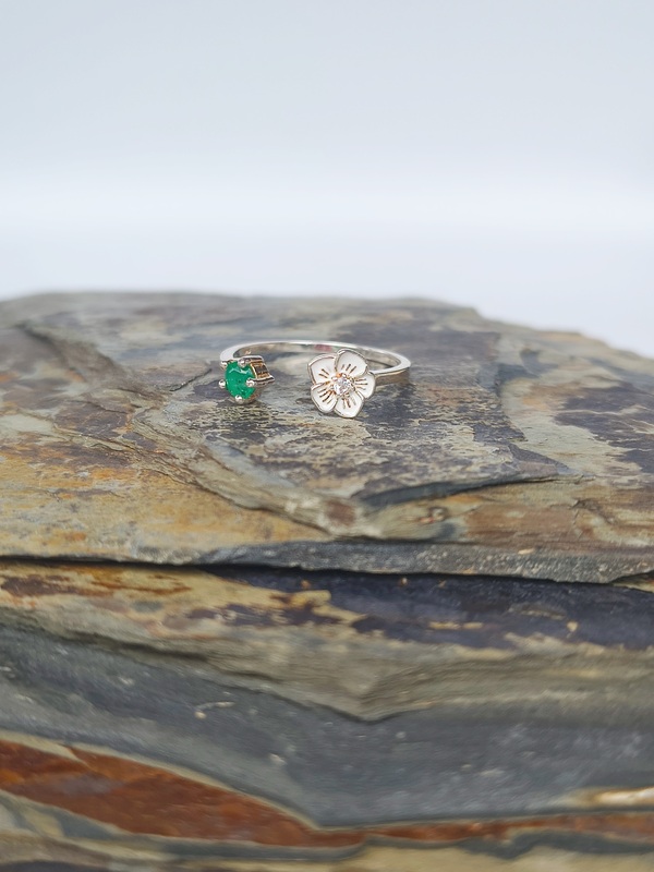 El Anillo Jardín Esmeralda es una joya de delicadeza poética que captura la magia de un jardín en flor sobre la mano. Su diseño abierto y ajustable presenta dos extremos que dialogan entre sí: de un lado, una flor de cerezo en plata 925 con una circonita blanca en su centro que evoca el rocío de la mañana; del otro, una esmeralda colombiana natural de corte facetado en engaste dorado, cuyo verde vivo recuerda la hoja más fresca del jardín. La banda fina y abierta une ambos elementos con la ligereza de un tallo que apenas toca la piel.