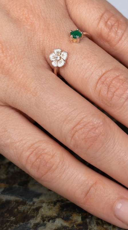 - Diseño duo abierto: dos elementos que se complementan: flor de cerezo y esmeralda natural, unidos por una banda fina y elegante.