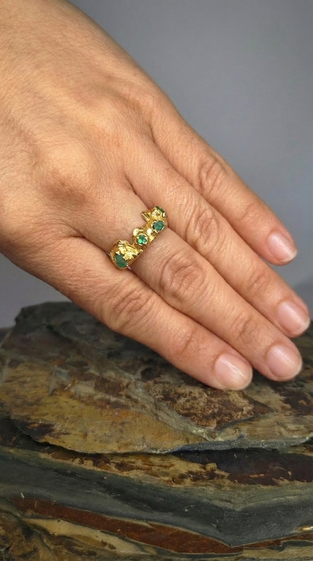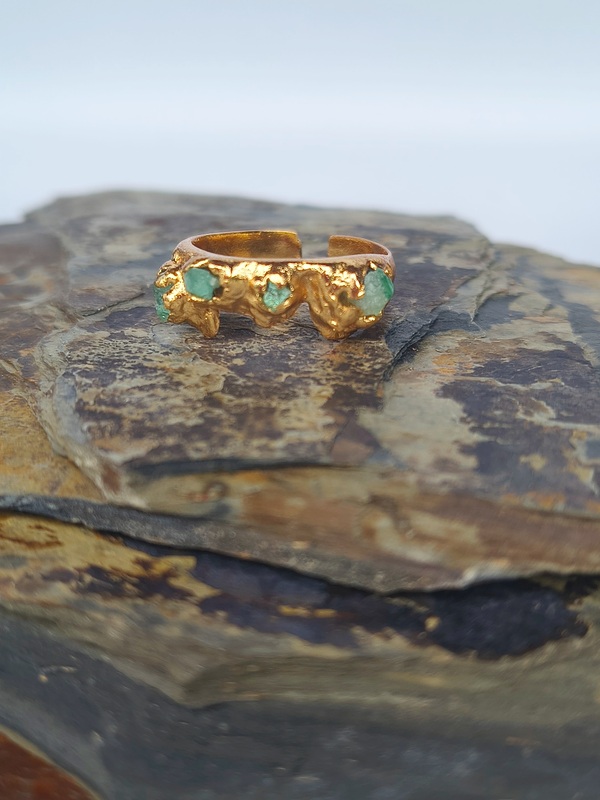 Anillo Moraya Esmeralda – Cobre con oro laminado y esmeraldas naturales en bruto