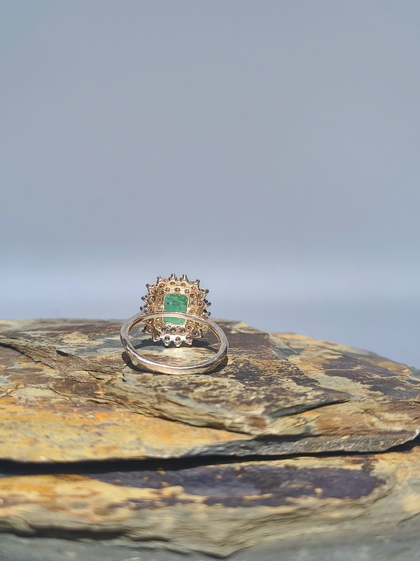 - Doble halo de circonitas redondas: dos coronas concéntricas de piedras blancas que amplifican el brillo y enmarcan la esmeralda con generosidad.