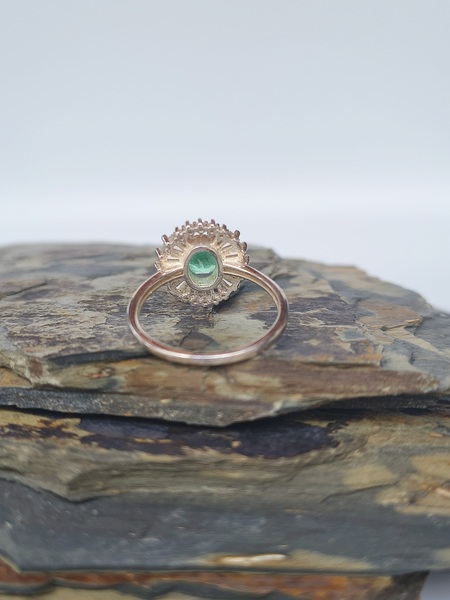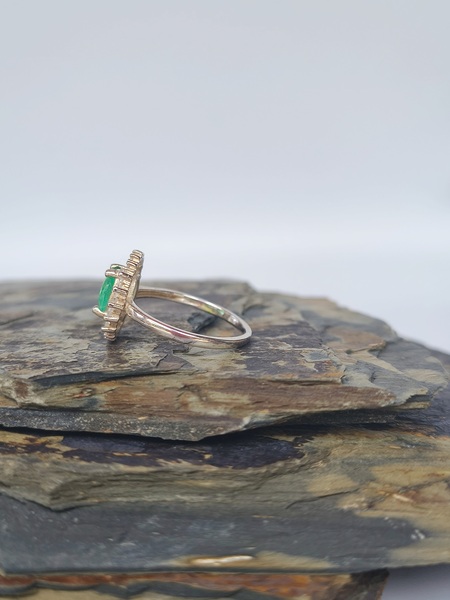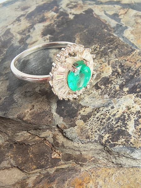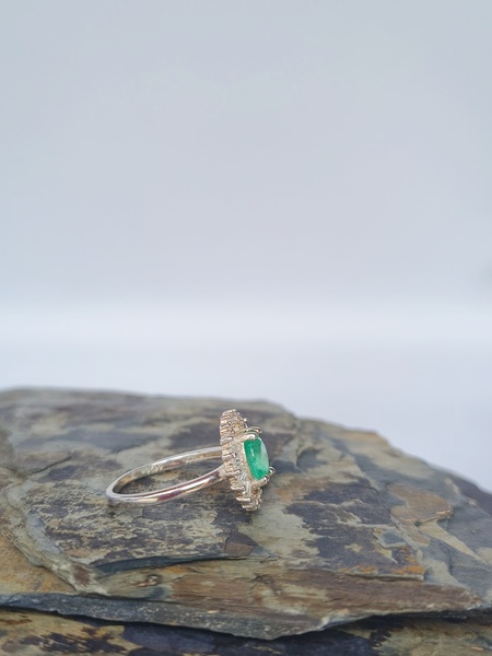 CaracterísticaDetalleTipoAnillo solitario con halo ballerinaMaterial basePlata de ley 925 (Sterling Silver)Piedra centralEsmeralda natural, corte ovalado facetadoPiedras secundariasCirconitas blancas corte baguette (halo radial)DiseñoBallerina / corona radianteFabricaciónArtesanal